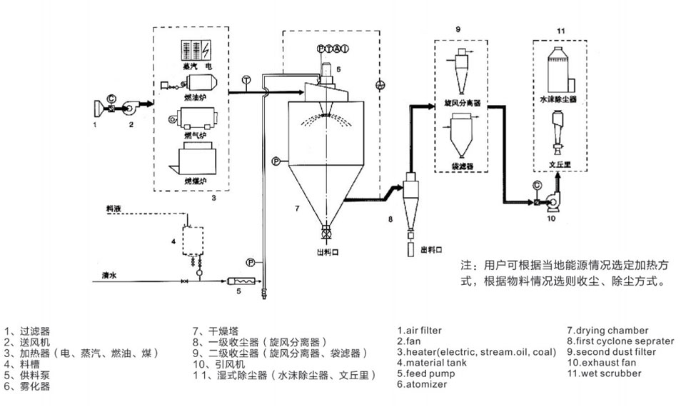 噴霧干燥機為開式循環,并流式,離心式霧化。干燥介質空氣經過初、中效空氣過濾器過濾后根據操作指令由鼓風機吸取再經加熱器加熱通過高效過濾器的熱風分配器進入噴霧干燥主塔。液體物料根據操作指令經過蠕動泵,進入高速旋轉的離心噴頭,在離心力作用下被分散成小霧滴。在噴霧干燥主塔內,小霧滴與熱風在充分接觸,沿其特定路徑進行熱交換后被干燥成為產品,然后通過旋風分離器實現分離,固體物料被收集,氣體介質再經過過濾后被排出。整套噴霧系統易清潔、無死角,符合GMP要求。